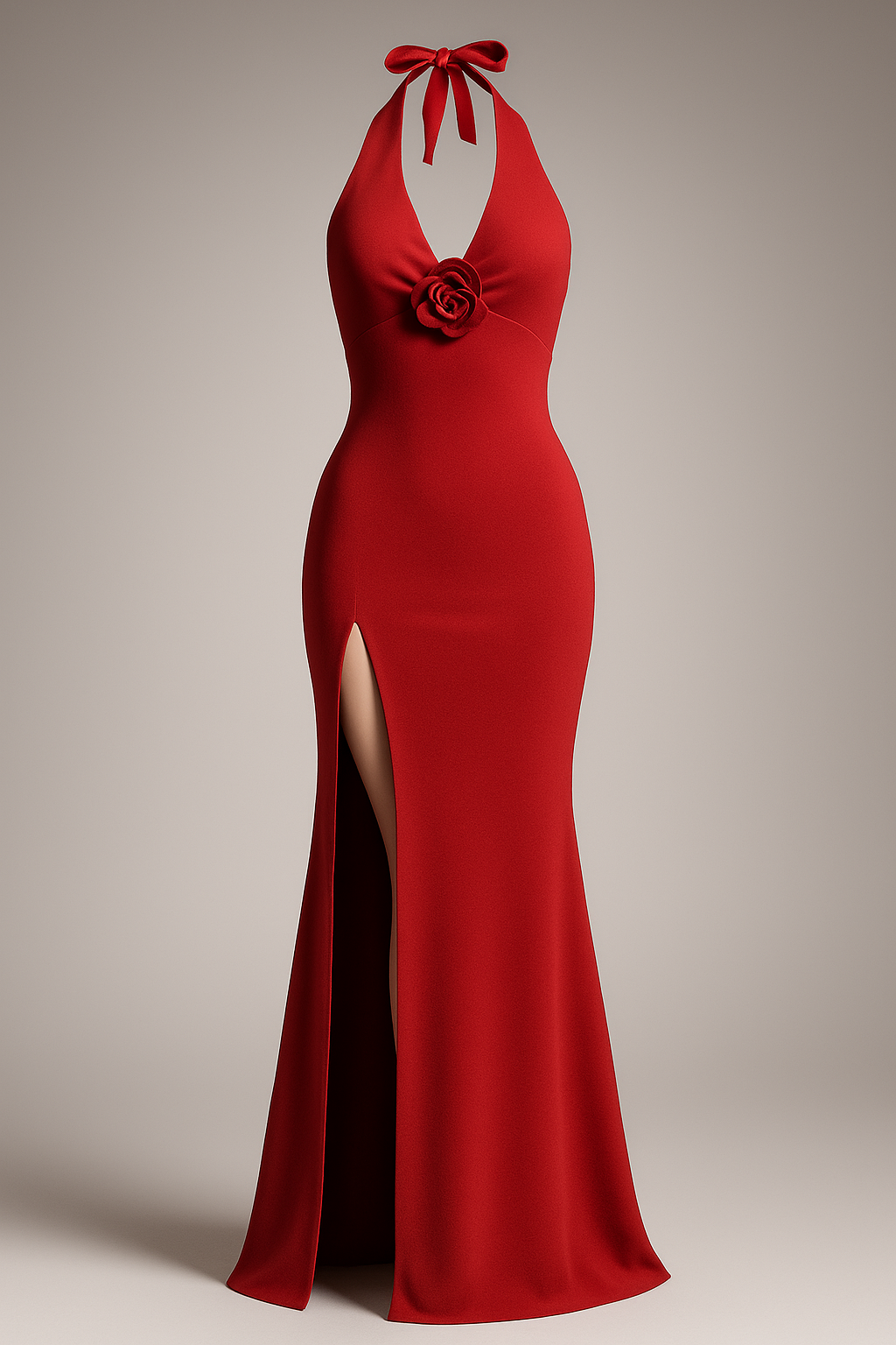 Luxury 3D Floral Halter Maxi Dress – Red / Black